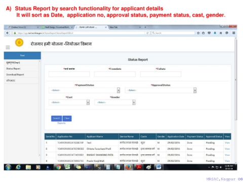 A) Status Report by search functionality for applicant details It will sort as Date, application no, approval status, payment status, cast, gender. MRSAC,Nagpur ©® MRSAC,Nagpur ©®