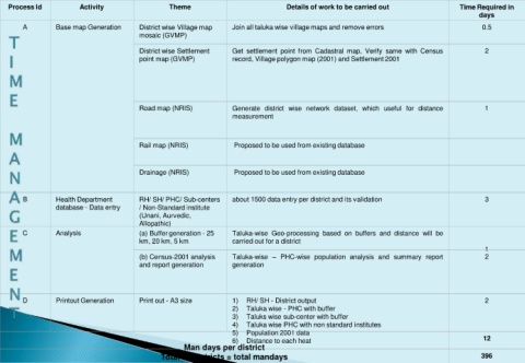 Process Id Activity Theme Details of work to be carried out Time Required in