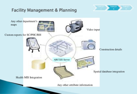TARGET II TARGET TARGET TARGET I II III Any other department’s maps Video input Custom reports for SC/PHC/RH Construction details ARCGIS Server Spatial database integration Health MIS Integration Any other attribute information