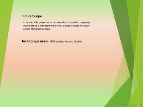 Future Scope In future, this project may be extended to handle completely maintenance & management of solar assets installed by MEDA across Maharashtra State. Technology used- GPS enabled Android Mobiles MRSAC,Nagpur ©® MRSAC,Nagpur ©®